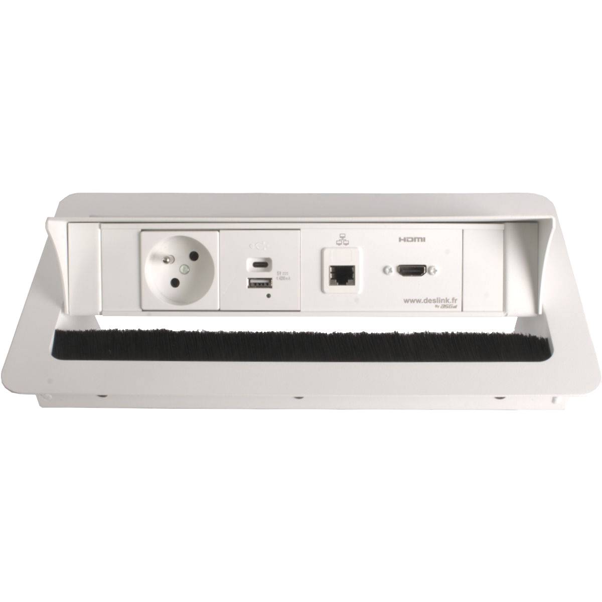 Boitier de connexion à encastrer, En acier et aluminium, Trappe amovible, Ouverture manuelle, équipé d’1 secteur NF 230V, 1 Double chargeur USB A+C 4.2A, 1 HDMI 2.0, 1 RJ45 Cat6A Finition Blanche, câblé 2m en fiches mâles, pour connecter ou alimenter vos périphériques mobiles directement sur votre bureau.
