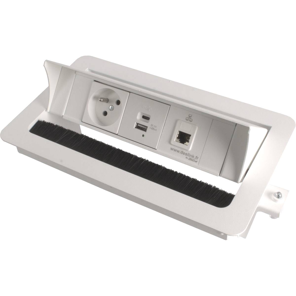 Boitier de connexion à encastrer, En acier et aluminium, Trappe amovible, Ouverture manuelle, équipé d’1 secteur NF 230V, - Double chargeur USB A+C 4.2A,1 RJ45 Cat6A, Finition Blanche, câblé 5m en fiches mâles, pour connecter ou alimenter vos périphériques mobiles directement sur votre bureau.