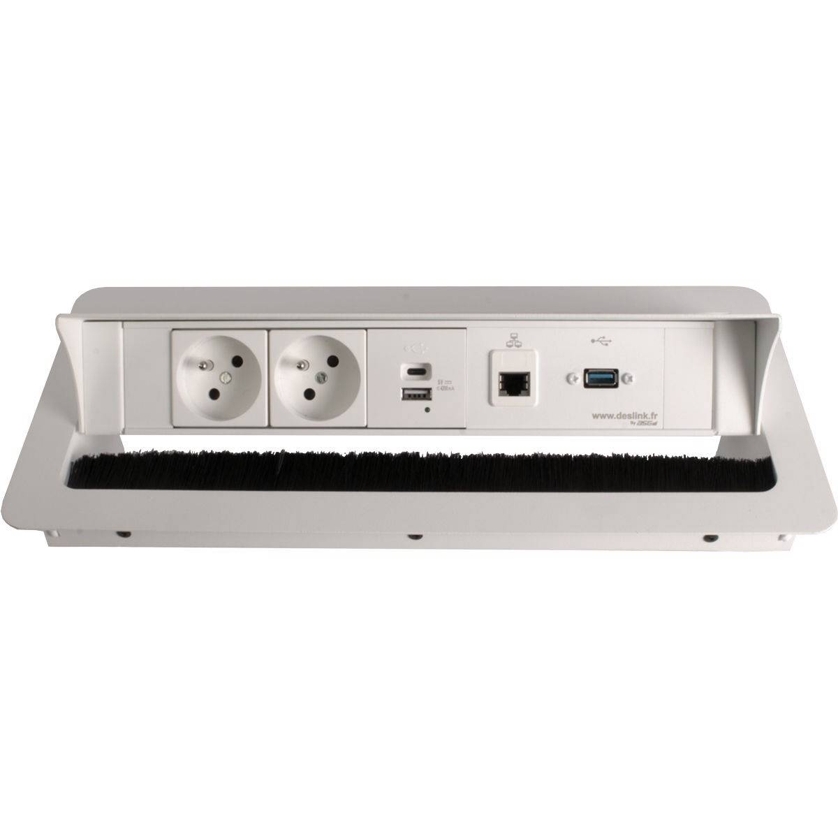 Boitier de connexion à encastrer, En acier et aluminium, Trappe amovible, Ouverture manuelle, équipé d’2 secteurs NF 230V, 1 Double chargeur USB A+C 4.2A, 1 RJ45 Cat6A, 1 USB data 3.0 Finition Blanche, câblé 5m en fiches mâles, pour connecter ou alimenter vos périphériques mobiles directement sur votre bureau.
