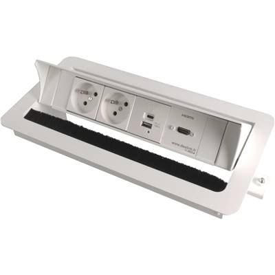 Boitier de connexion à encastrer, En acier et aluminium, Trappe amovible, Ouverture manuelle, équipé d’2 secteurs NF 230V, 1 Double chargeur USB A+C 4.2A, 1 HDMI 2.0 Finition Blanche, câblé 5m en fiches mâles, pour connecter ou alimenter vos périphériques mobiles directement sur votre bureau.