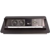 Boitier de connexion à encastrer, En acier et aluminium, Trappe amovible, Ouverture manuelle, équipé d’2 secteurs NF 230V, 1 Double chargeur USB A+C 4.2A, 1 HDMI 2.0 Finition Noire, câblé 5m en fiches mâles, pour connecter ou alimenter vos périphériques mobiles directement sur votre bureau.