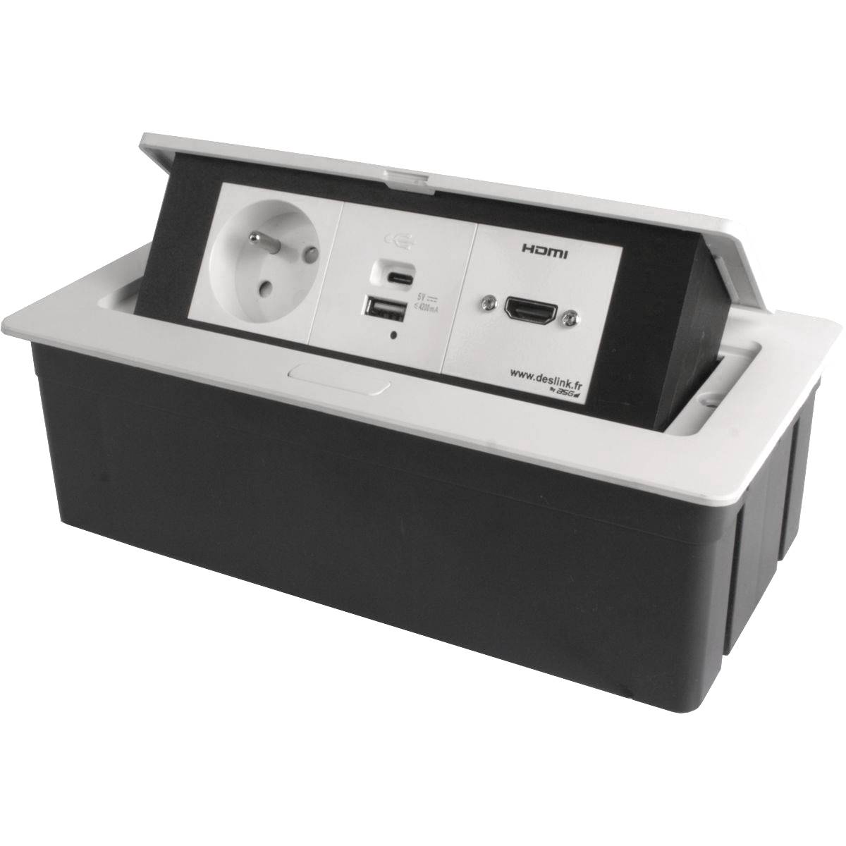 • Boîtier escamotable Blanc, équipé 1 secteur, 1 chargeur A+C et 1 HDMI précâblé 5 m