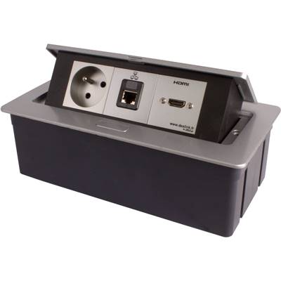 Boitier de connexion à encastrer, En aluminium, Trappe amovible, Ouverture automatique, Ouverture manuelle, équipé d’1 secteur NF 230V, 1 HDMI 2.0, 1 RJ45 Cat6A, Finition Silver, câblé 2m en fiches mâles, pour connecter ou alimenter vos périphériques mobiles directement sur votre bureau.