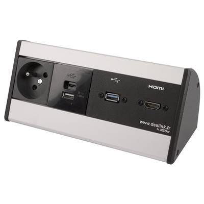 Boitier de connexion à poser ou fixer sur la table, En aluminium, équipé d’1 secteur NF 230V, 1 Double chargeur USB A+C 4.2A, 1 HDMI 2.0, 1 USB data 3.0 Finition aluminium naturel brossé, Flasques noires, câblé 5m en fiches mâles, pour connecter ou alimenter vos périphériques mobiles directement sur votre bureau.