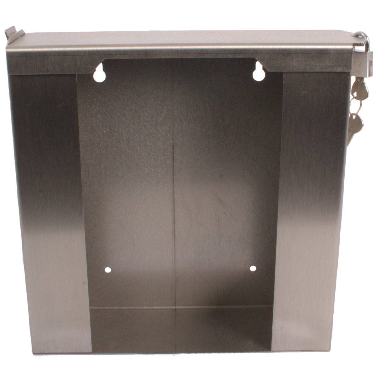 Boitier distributeur ASG avec capot verrouillé par cadenas, Capacité 2 boites, A fixer au mur, En inox Gr220, Finition inox brossé, idéal pour créer un point de distribution bien identifié d’accessoires à usage unique conditionnés en boite carton avec ouverture sur le dessus aux dimensions maximales suivantes : Longueur 245 mm x Largeur 125 mm x Profondeur 75 mm. Dans ce distributeur polyvalent, les boites s’empilent en position horizontale, ce qui vous permettra de panacher différents produits et/ou différentes tailles du même produit. Plaquette de pictogrammes autocollants fournie.