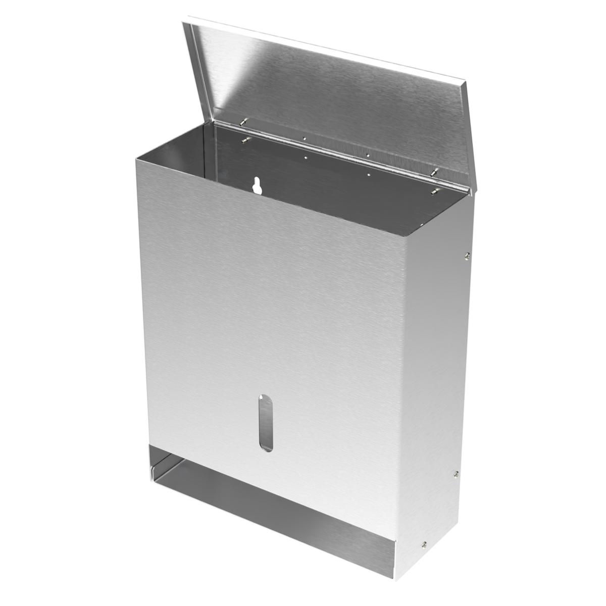 Boitier distributeur ASG avec couvercle de protection anti-poussière, Jauge de remplissage, A fixer au mur, En inox Gr220r, Finition inox brossé, idéal pour créer un point de distribution bien identifié de masques chirurgicaux ou de masques de protection respiratoire FFP2 conditionnés en sachet individuel aux dimensions maximales suivantes : Longueur 250mm x Largeur 100 mm x Epaisseur 35 mm. Les sachets se présentent à plat en position horizontale dans le distributeur. Plaquette de pictogrammes autocollants fournie.