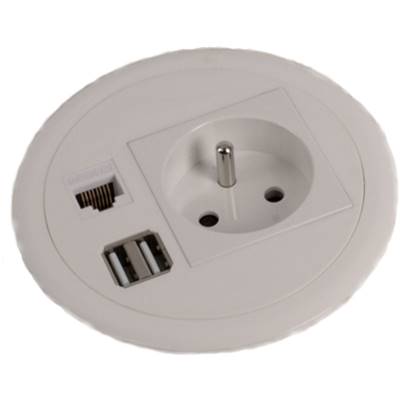 Mini Boitier de Table Rond Encastrable Blanc 1 Secteur, 1 RJ45, 1 Double Chargeur USB Type A + CÂBLE D'ALIMENTATION 2 MÈTRES