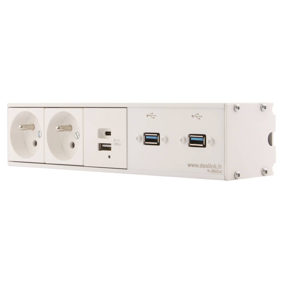 Boitier de connexion à faible encombrement, À poser ou à fixer, En aluminium, équipé d’2 secteurs NF 230V, 1 Double chargeur USB A+C 4.2A, 2 USB data 3.0 Finition Blanche, câblé 5m en fiches mâles, pour amener toute la connectique dont vous avez besoin, là où vous en avez besoin.