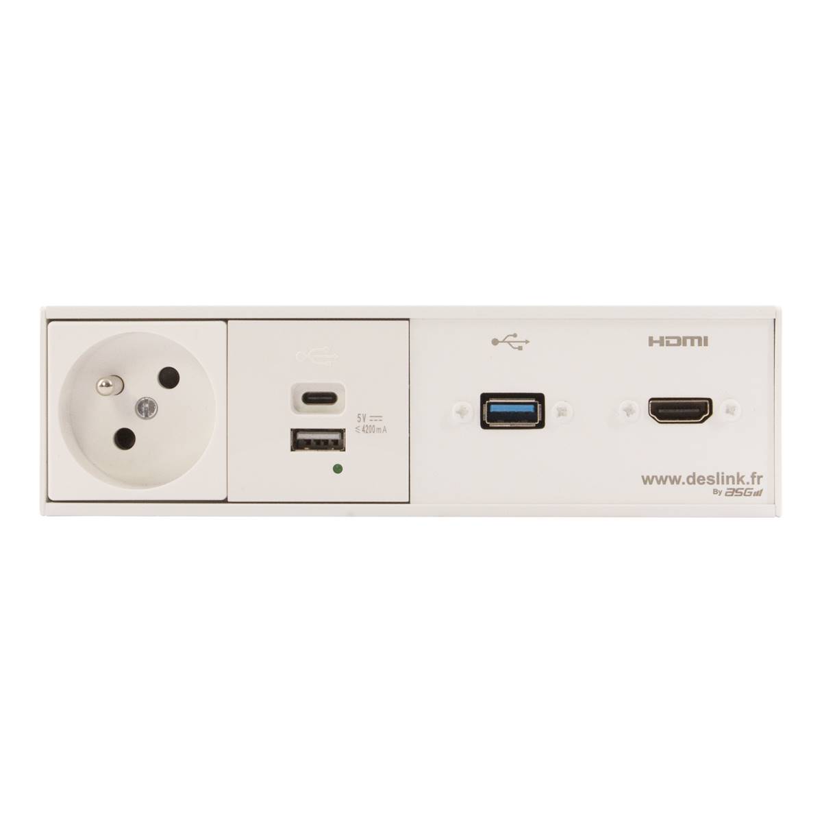 Boitier de connexion à faible encombrement, À poser ou à fixer, En aluminium, équipé d’1 secteur NF 230V, 1 Double chargeur USB A+C 4.2A, 1 HDMI 2.0, 1 USB data 3.0 Finition Blanche, câblé 5m en fiches mâles, pour amener toute la connectique dont vous avez besoin, là où vous en avez besoin.
